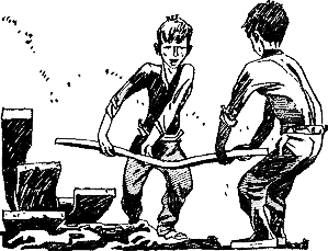 Алеш сыпал в бабушкин бельевой бак цемент и песок, а мы с Чендой пошли за водой. Мирек тем временем вытаскивал из сарая все, что валялось на полу, в основном доски. Ченда качал воду, а я смеялся, потому что у него ничего не получалось и вода не текла. Ченда потребовал, чтоб я перестал смеяться, а попробовал бы сам покачать, раз я такой умный. С видом знатока он уставился в трубу, из которой должна была течь вода.