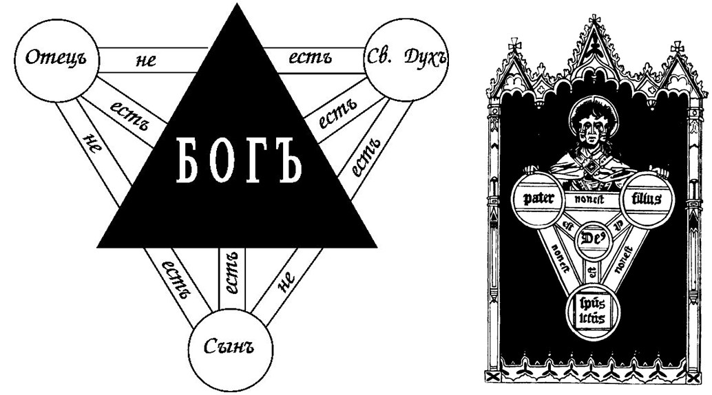 В этом символическом изображении «Бога-Троицы» круги «Отец», «Сын», «Св. Дух» – вне треугольника «Бог», хотя и соединены как с ним, так и друг с другом. Но более того: рисунок может быть интерпретирован как план трёхгранной пирамиды, основание которой – треугольник «Отец – Сын – Св. Дух», а «Бог» – вершина пирамиды – находится вне плоскости бытия «Отец – Сын – Св. Дух» (триединства меры-материи-информации), которой принадлежит всё тварное.