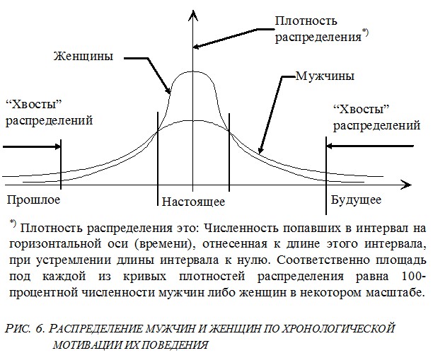 Рис. 6 интересен тем, что показывает качественные различия в мотивации поведения, обусловленные свойствами психики мужской и женской составляющих общества: то есть в мотивации поведения множества мужчин и множества женщин, а не в мотивации поведения конкретного отдельно рассматриваемого человека, который вне зависимости от его пола может реально принадлежать всякому интервалу на оси времени. В полосе «Настоящее» женщины численно преобладают над мужчинами, а в «хвостах» распределений наоборот: мужчины численно преобладают над женщинами. Но эти особенности распределений полов по хронологической мотивации поведения их представителей выражаются во множественных явлениях жизни общества.