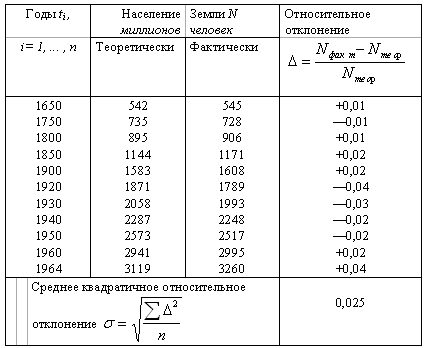 После этого рисунка Г. М. Идлис приводит ниже помещенную таблицу 1, в которой сравнивает теоретическую численность населения Земли, полученную на основе гиперболического закона (ф. 2) с фактической численностью населения в разные годы, начиная с 1650 г. по 1964 г. В ней он показывает, что среднее квадратичное отклонение теоретических оценок от фактических данных составляет 0,025.