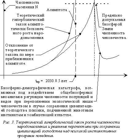 На рис. 3 показано отклонение реальной кривой численности населения от теоретического закона такое, что биосферно-демографическая катастрофа наступает спустя какое-то время после tкр = 2030 ± 5 лет. Но необходимо иметь в виду, что хотя СПИД, рост смертности от раковых заболеваний и т. п. позволяют думать, что темпы прироста населения падают по сравнению с теоретически ожидаемыми на основе гиперболического закона, вследствие чего на рис. 3 схематично показано действительное взаимное положение теоретической кривой и реальной кривой численности населения, тем не менее науке неизвестно ничего определенного о действительном уровне предельной численности человечества[80]80