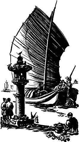 Вечером я возвратился на судно и, стоя на палубе, следил, как туман медленно заволакивал гавань и берег. Кругом нас дремали неповоротливые джонки. Спереди у них нарисовано два огромных глаза, чтобы предохранять судно от подводных камней. Паруса из плетеной соломы безжизненно повисли на реях. Все спокойно вокруг. Тихо надвигается ночь.