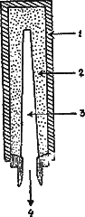 Разрез увеселительной ракеты: 1 – картонная трубка; 2 – порох; 3 – место горения; 4 – выход газов.
