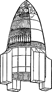 Чтобы перейти от ракеты к ракетному кораблю-звездолету, вообразите себе исполинскую ракету с каютой для пассажиров, с огромным запасом горючего вещества и с особым устройством для управления горением. Каюта должна быть устроена примерно так, как в современной подводной лодке: в ней должны находиться приборы для замены израсходованного кислорода свежим, запасы пищи, питья, набор инструментов для ориентирования и прочее.