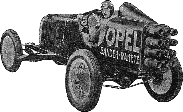 Ракетный автомобиль Опеля. В 1928 г. в Германии был проделан ряд опытов установки ракет на автомобиле в качестве двигателя. При горении ракет автомобиль мчался с огромной скоростью.