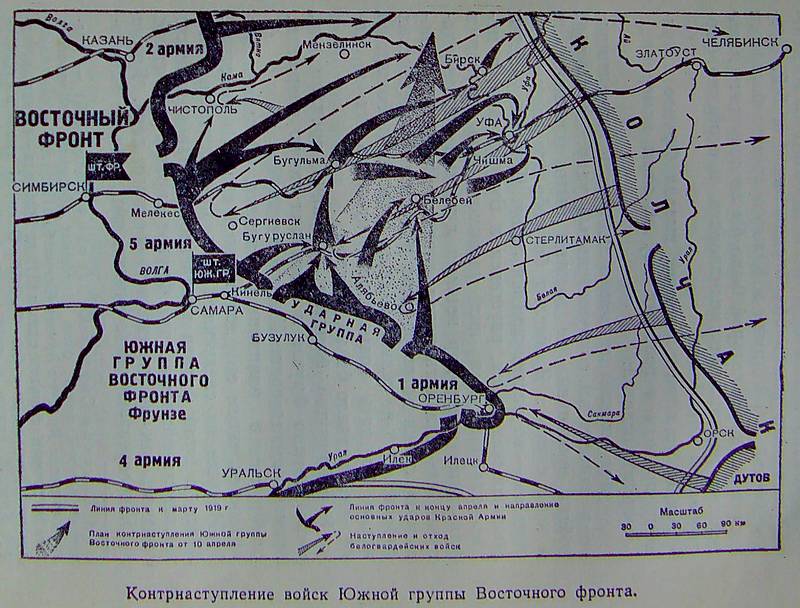 Самара – Кннель – Бузулук – Оренбург. Три колчаковских корпуса генерала Ханжина хотя и наступали успешно, но двигались по враждебной им земле, политические цели колчаковцев были чужды как русскому, так и башкирскому населению. А плети и виселицы колчаковских карателей и интервентов вызывали у народа беспредельную ненависть.