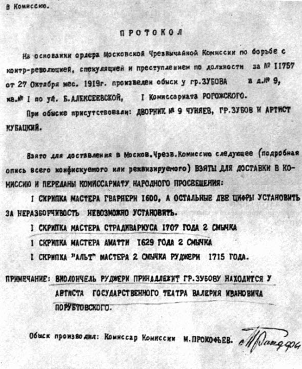 Протокол об изъятии музыкальных инструментов. 1919 г.