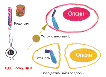 Родопсин, за свой цвет названный зрительным пурпуром, становится светло-желтым, почти совершенно прозрачным.