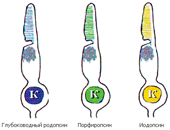 Соединяясь же в колбочках с ретиналем-два (у него две двойные связи), опсин превращается в «глубоководный» родопсин (названый так потому, что впервые был обнаружен у рыб), порфиропсин и иодопсин – соответственно в синем, зеленом и желтом фоторецепторах.