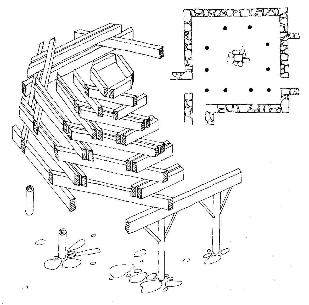 Витрувий писал об одной из вариаций схемы – на нашем рисунке представлена другая, с восьмигранным шатром. В Этнографическом музее Тбилиси смонтированы и еще более сложные – с шестнадцатигранным шатром. Промежутки между брусьями (об этом также можно прочесть у Витрувия) заполнялись обрезками дерева и щепой. Все вместе засыпалось глиной и плотно утаптывалось. Возникало теплое, водонепроницаемое покрытие. Снаружи, над низкими каменными стенами (у Витрувия описаны деревянные срубы) возвышались только пологие холмики, поросшие травой. Центральное отверстие, через которое выходил дым очага, закрывалось хитроумно сконструированной кожаной крышкой – его можно было открывать или закрывать, потянув за веревку