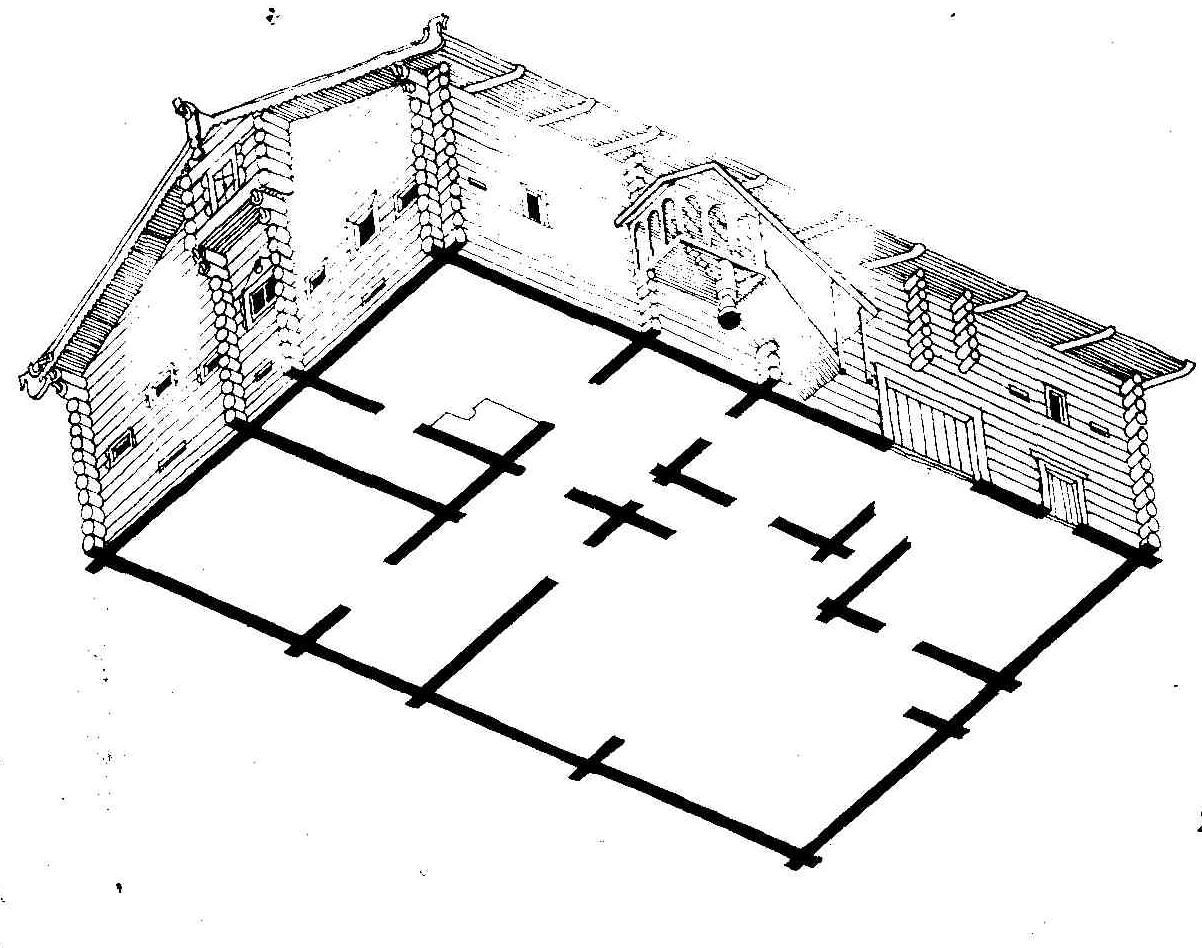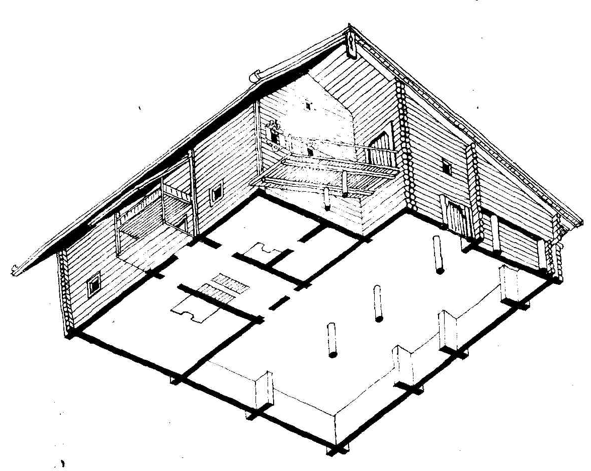 И конструкция окон, и конструкция деревянного сруба, и условно обозначенная на рисунке кровля из осиновых дощечек – лемеха, и, наконец, использование дощатых наличников дверных и оконных проемов восходят к глубокой древности лесистой Северной Европы. Конструкции, отработанные к началу нашей эры поколениями безвестных плотников, оказались столь по-своему совершенными, что, несколько видоизменяя планировку жилищ, можно было вновь и вновь воспроизводить приемы работы