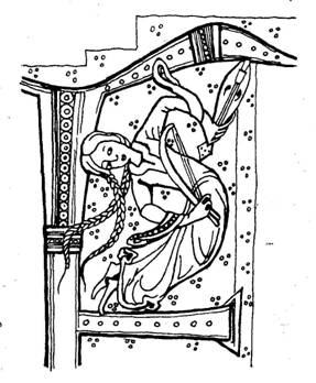 Западной Европе светские, мирские мотивы глубоко проникли в искусство. Не только во все виды прикладного искусства. На полях манускриптов, в утонченных изображениях начальных букв глав церковных книг – инициалах можно часто, как и на этом рисунке, увидеть гибких гимнастов или танцовщиц. Эта девушка, изогнувшаяся в быстром танце, держит в руках смычек и маленькую скрипку-фидель – верный знак расцвета музыкального искусства. Твердость и тонкость линий, нарядность поверхности, орнаментальность – вот главные признаки эпохи. Естественно, что те же признаки характерны и для самого популярного из искусств – архитектуры жилища
