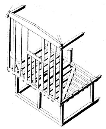 На уличный фасад выходит «продух» – для вентиляции сеновала. Кровлю держат горизонтально уложенные слеги, спереди прикрытые тесинами с завершением в виде конских голов. Верхний стык тесин прикрыт выдолбленным снизу бревном – «охлуп-нем», имеющим завершение в виде птицы, фасадный стык тесин прикрыт «полотенцем». По слегам уложены комлем вниз молодые ели – своеобразные стропила, их загнутые вверх концы держат «поток» – выдолбленное бревно водосброса
