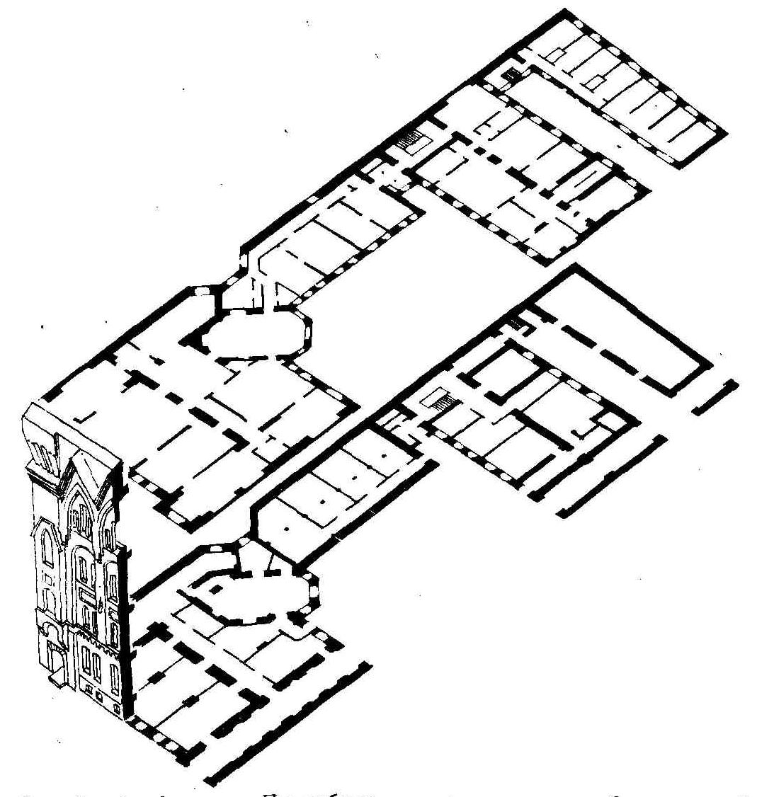 Интересы владельца диктовали архитектору принцип решения – «выжать» из участка все, что можно. Последовательно совершенствуя приемы планировки, архитекторы разработали сложную систему дворов-колодцев, через которые в комнаты нижних этажей поступал некоторый минимум света и воздуха. Изображенный на рисунке доходный дом В. Ф. Штрауса по 2-й линии Васильевского острова, то есть в весьма респектабельном районе Петербурга, еще не достиг «идеала». К узкому главному фасаду примыкает почти кубический объем, занятый просторными квартирами наиболее богатых жильцов. Эти квартиры занимают целый этаж (на первом этаже отрезан проезд во двор, под аркой). В глубь участка, за блоком хозяйственных помещений (выше над ними устроены, квартиры второго класса) расположен блок квартир третьего класса, а за узкой «щелью», над каретным сараем, коммунальные квартиры, каждая комната которых сдавалась жильцам по отдельности. Самым лучшим и, естественно, самым дорогим был второй этаж, по французскому образцу именовавшийся бельэтажем. Доходные дома (в большинстве их квартиры перепланированы после 1917 года) четко отражали классовую структуру города