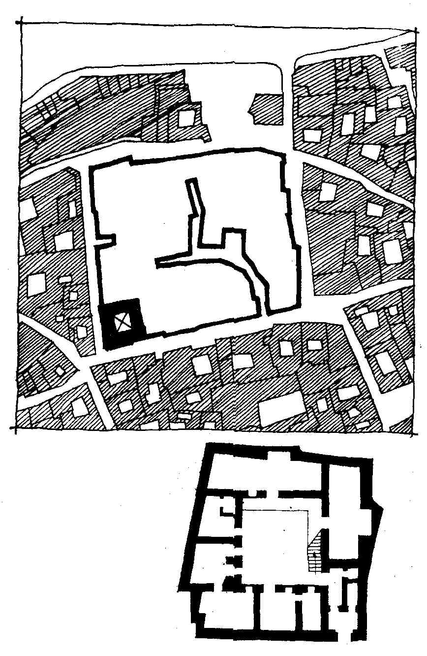 Итак, в Риме (совершенно независимо и одновременно – в Древнем Китае и Древней Индии) утверждается принцип, согласно которому лицевая часть здания по ряду соображений как бы отделяется, обособляется от собственного жилища. Вроде бы принадлежа каждому зданию по отдельности, она в действительности принадлежит городу как некоторому неделимому целому. Именно этому принципу принадлежало будущее, когда после средневековой интермедии с V по X век городской тип дома утверждается в правах. Дело в том, что помимо использования части уцелевших зданий римской эпохи хранителями памяти о прошлой, славе городов в эпоху междувременья стали монастыри, в которых регулярность, правильная организация фасада, за которым скрывалось множество келий, были обязательной строительной нормой по идейным соображениям. Строители, начавшие работу в бурно разраставшихся городах XI и последующих веков, прошли школу монастырского строительства, и те же принципы очень рано начинают применяться в городе, по крайней мере при обстройке площадей, служивших рынками (пример – на нашей иллюстрации).