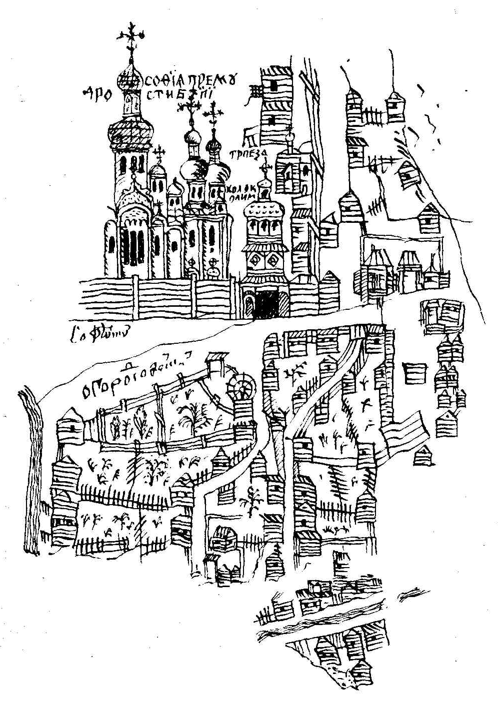 Избранной нами для воспроизведения фрагмент ушаковского плана вполне точно, хотя и не в масштабе, отражает характер застройки, вплотную примыкающей к храму св. Софии, увенчанному уже главами в стиле украинского барокко. На плане ясно проступает аграрный характер города, в котором площадь застройки во много раз уступает площади садов и огородов. Если же учесть, что при сложном рельефе Киева едва ли не половина территории была занята крутыми, непригодными к использованию склонами, то разреженность городской ткани становится очевидной. В период, когда составлялись чертеж и «роспись» к нему, город находился под двойным управлением: воеводским (без вмешательства в гражданские дела) и магистрата, осуществлявшего некоторые регулирующие действия относительно застройки преимущественно на территории Подола
