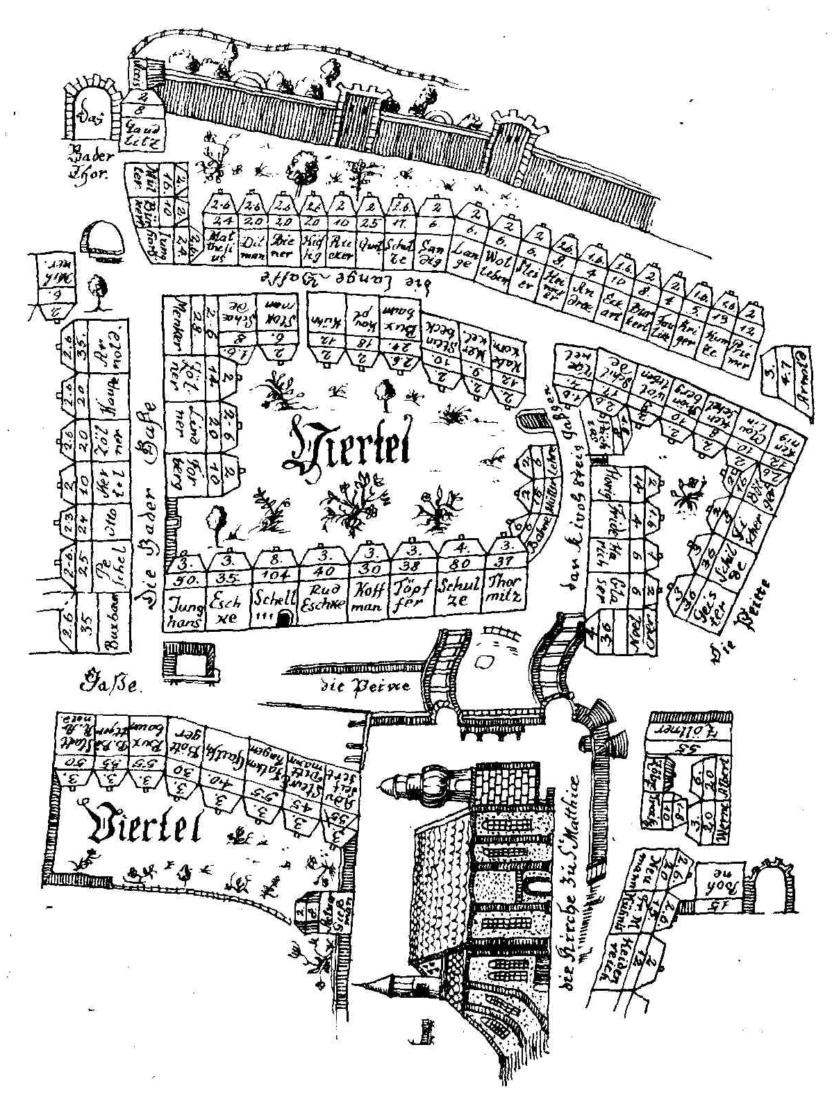 Воспроизведенная на нашем рисунке центральная часть древнего Лайснига (округ Лейпциг) позволяет познакомиться с редчайшим документом. Гравированный на меди план, выполненный в масштабе 1:400, детален и точен. Перечислены имена владельцев, число обитателей каждого дома и сумма выплачивавшегося ими налога. Лайсниг избежал замены стен земляными укреплениями, и хотя длительное время процветал за счет суконного производства, его обошла промышленная революция в Германии. Благодаря этим обстоятельствам город сохранил средневековую планировку и к середине XVIII века, что позволяет отвергнуть миф о затесненности средневекового города. Замкнутые, обстроенные по периметру трех-че-тырехэтажными домами кварталы сохраняют незастроенными обширное пространство внутри, занятое садами и огородами. Поскольку сукновальные мельницы были устроены на берегу реки, за чертой городских стен, состояние жилой среды можно счесть вполне удовлетворительным в санитарном отношении. Реальная драма европейского жилого квартала сопряжена отнюдь не со средневековьем, но с капиталистической индустриализацией XVII – XIX столетий