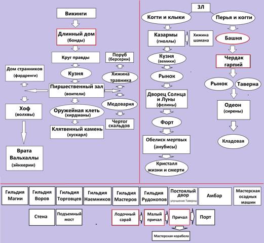 Причем стоило сказать, что для тех или иных построек зачастую следовало создать определенные здания, которые на задачу обороноспособности влияли почти никак, но все же являлись необходимыми. Краткая схема развития замка, без учета побочных возможностей, выглядела так: