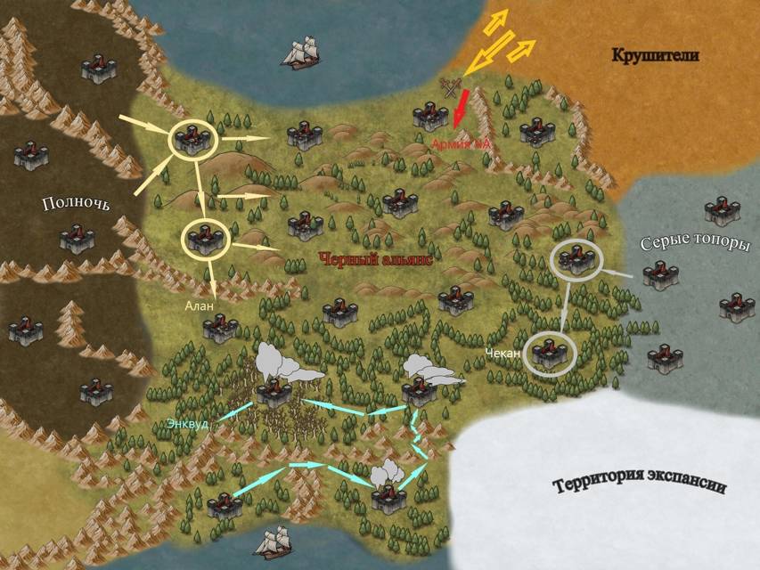 Казалось бы, что с того, что был захвачен еще один замок темных? У теперь уже моего клана имелось еще много крепостей. Но если посмотреть на карту, оптимизм знатно убывал. Говоря коротко, все было плохо. Чуть подробнее – все было очень плохо. Шутка. Ладно, рассмотрим положение совсем подробно. К началу войны у темного клана было семнадцать замков. Из которых лишь два находились в недостроенном состоянии (те самые, что захватили у меня). В настоящий же момент из семнадцати замков четыре оказались потеряны, три пребывали в состоянии руин. То есть лишь десяток могли приносить ресурсы и поставлять солдат. Притом темный клан ответил лишь рейдом Сата, разрушив две крепости, которые «Серые топоры» уже успели вернуть. Положение складывалось не в пользу моих товарищей и обещало стать только хуже.
