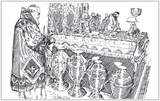 [Закрыть]священники, сослужащие Патриарху, предносят (несут) сосуды с Миром (и освященным, и еще не освященным) и ставят их вокруг Престола. Сосуд же с преждеосвященным Миром ставится на Престоле. После слов: «И да будут милости…», – Патриарх освящает Миро, благословляя трижды крестным знамением каждый сосуд и читая особую молитву.
