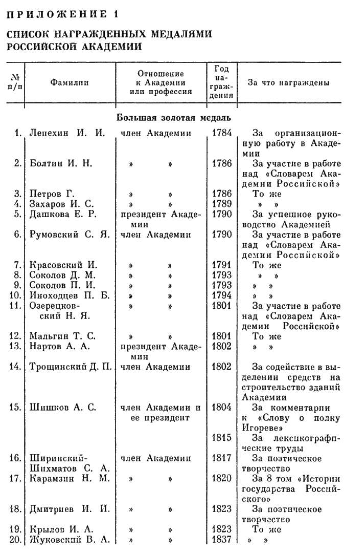 Создав нормативный словарь русского языка, Академия выполнила поставленную перед ней «Веком просвещения» историческую задачу. С ним навечно связали свои имена такие выдающиеся деятели русской культуры и науки, как Е. Р. Дашкова, И. И. Лепехин, Н. Я. Озерецковский, Д. И. Фонвизин, Г. Р. Державин, А. А. Барсов и др. Изданием этого словаря Академия утвердила свое право на существование, доказала, что она необходима. «Невысок был в ту пору уровень общественной образованности, тем не менее отовсюду, изо всех слоев общества были призваны живые силы для участия в предпринятом Академией труде», – так оценивал общенациональное значение первого начинания известный историк М. И. Сухомлинов [80, вып. 8, с. 366]. И «Словарь Академии Российской» стал вечным памятником Академии и русской культуры конца XVIII в. Вероятно, поэтому исследователей, обращавшихся к истории Российской Академии, больше привлекал ее первый, дашковский период.