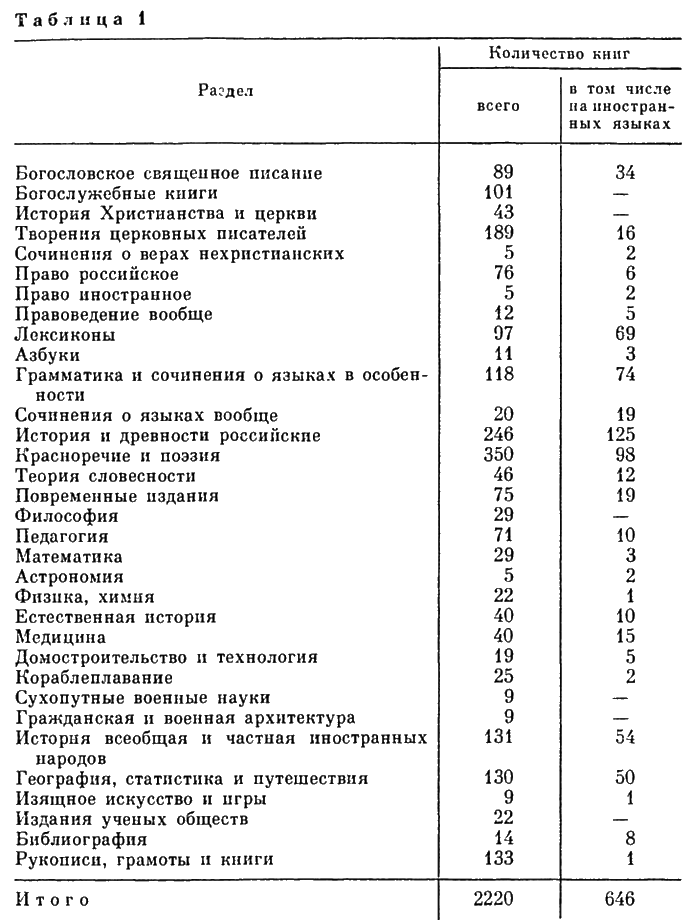 Из таблицы явствует, что среди книг академической библиотеки наибольший удельный вес занимали собрания разделов: «Красноречие и поэзия» (15 %), «История и древности российские» (11 %), «Творения церковных писателей» (8 %), «Всеобщая история», «География и статистика…» – по 6 % фонда.