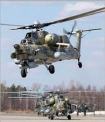 Армейский боевой и транспортнобоевой вертолет одновинтовой схемы с двумя двигателями ТВ3-117 мощностью 2200 л.с. В 1970–1989 гг. на заводах в Арсеньеве и Ростове-на-Дону построено более 3200 экз., из которых около 600 экспортировано в более 30 стран (в вариантах Ми-25 и Ми-35). Основные модификации: Ми-24Д и Ми-25 (с комплексом ПТУР «Фаланга-П» и пулеметом ЯкБ-12,7); Ми-24В и Ми-35 (с ПТРК «Штурм-В»); Ми-24П и Ми-35П (с пушкой ГШ-30К); Ми-24ВП (с пушкой ГШ-23); Ми-24К (разведчик-корректировщик); Ми-24Р (вертолет радиационно-химической разведки); Ми-24ВМ и Ми-35М (модернизированный вертолет с несущей системой Ми-28 и новым оборудованием, первый полет – в марте 1999 г.) и др. В 2000 г. начаты работы по модернизации вертолетов Ми-24В и Ми-24П Армейской авиации РФ с целью придания им возможностей круглосуточного боевого применения (варианты Ми-24ВК, Ми-24ПН и др.).