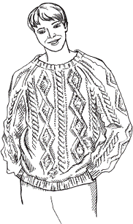 Сборка. Cшейте детали по линиям реглана и боковым швам. Наберите с изнанки горловины 90 петель и свяжите воротник высотой 12 см резинкой 1 х 1. Сложите его вдвое.
