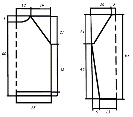 Провязав от резинки 88 рядов, для пройм закройте с обеих сторон в каждом 2-м ряду 1 раз по 4 петли, 2 раза по 2 петли, 3 раза по 1 петле. Провязав 36 рядов от начала убавлений для пройм, закройте для выреза горловины средние 28 петель и обе половинки вяжите раздельно, закрывая для закругления выреза с обеих сторон в каждом 2-м ряду 1 раз по 3 петли и 2 раза по 2 петли. Провязав 44 ряда от начала убавлений для пройм, закройте по 19 петель плеча.