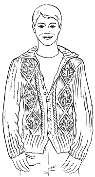 Перед. Начните вязать, как спинку. Провязав 210 рядов от полой резинки, для выреза горловины отметьте центральную петлю и закройте по обе стороны от нее в каждом 2-м ряду 23 раза по 1 петле. Провязав 84 ряда от начала убавлений для пройм, для плечевых скосов закройте с обеих сторон в каждом 2-м ряду 2 раза по 9 петель и 2 раза по 10 петель.