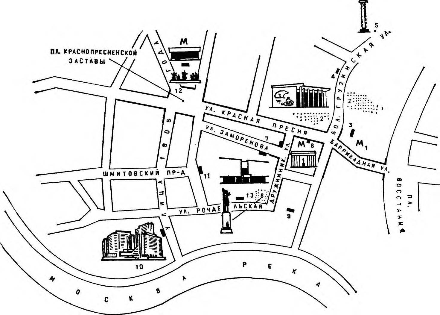 7. Всесоюзный киноцентр; 8. Детский парк культуры и отдыха им. Павлика Морозова; 9. Горбатый мест; 10. Центр международной торговли и научнотехнических связей; //. Дворец культуры им. В. И. Ленина; 12. Монумент в честь революции 1905-1907 гг.; 13. Историко-революционный музей «Красная Пресия».