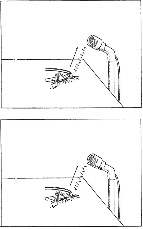 В этой связи более плодотворными оказались опыты, которые ставились над кузнечиками и сверчками. Эти опыты показаны на илл. 25. В одной комнате перед микрофоном, представляющим собой приемник, сидит оживленно стрекочущая особь. В соседней комнате перед вторым транслирующим аппаратом собрались ее брачные партнеры, которых нисколько не заботит, что рядом с ними под стеклянным колпаком сидит еще одна особь: ее пение напрасно, поскольку купол колпака не пропускает звук. Никто из партнеров не приближается к ней. Оптический образ не имеет никакого воздействия.