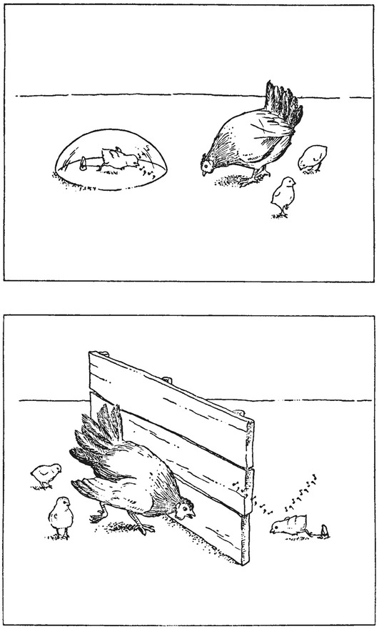 Если же мы поместим привязанного цыпленка под стеклянный колпак, так, чтобы наседка его видела, но не слышала, то его вид нисколько ее не встревожит.