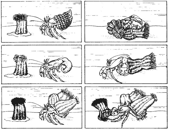 На всех этих иллюстрациях показаны один и тот же рак-отшельник и одна и та же кувшинка. Вначале мы видим, как у рака отняли кувшинку, которую он нес на своем панцире. Во втором случае его лишили и раковины, а в третьем рака-отшельника, прежде несшего на себе и раковину и кувшинку, подвергли длительному голоданию. Этого достаточно, чтобы рак испытал три разных состояния.