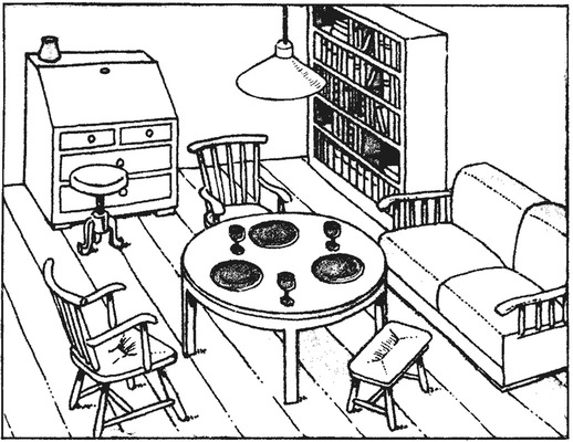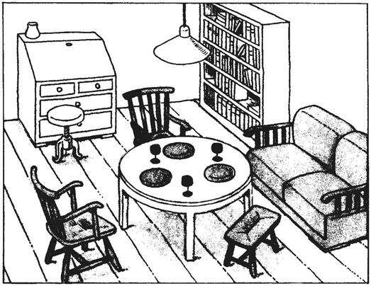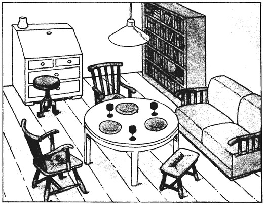 Такое положение дел поясняют три взаимосвязанные иллюстрации: 29, 30 и 31. На каждой из них показана одна и та же комната. Однако предметы, находящиеся в ней, окрашены в разные тона, соответствующие количеству тональностей действия, которые связывают с ними соответственно человек, собака и комнатная муха.