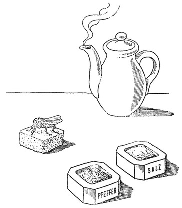 На илл. 32 ясно показано, насколько хорошо муха ориентируется в среде, которую представляет собой наша комната. Мухи прилетают сразу, как только на столе оказывается чашка с горячим кофе, поскольку они реагируют на тепло. Они начинают бегать по столешнице, которая имеет для них тональность бега. И поскольку у мух на лапках имеются вкусовые органы, раздражение которых вызывает выдвижение хоботка, они останавливаются, когда находят пищу, в то время как соприкосновение со всеми прочими объектами побуждает их к дальнейшему движению. В рассматриваемом случае мы можем особенно легко отделить окружающий мир мухи от ее среды.