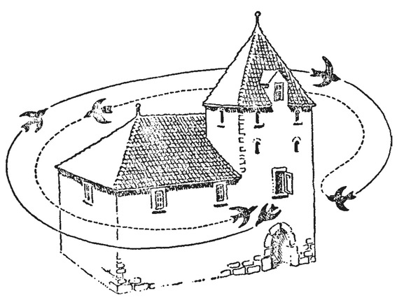 На илл. 34 представлены наблюдения над молодой галкой. Мы видим, что галка облетает весь дом, но потом возвращается и использует для обратного полета знакомый путь, чтобы вернуться к месту, откуда она вылетела и которое она бы не узнала, прилетев с другой стороны.