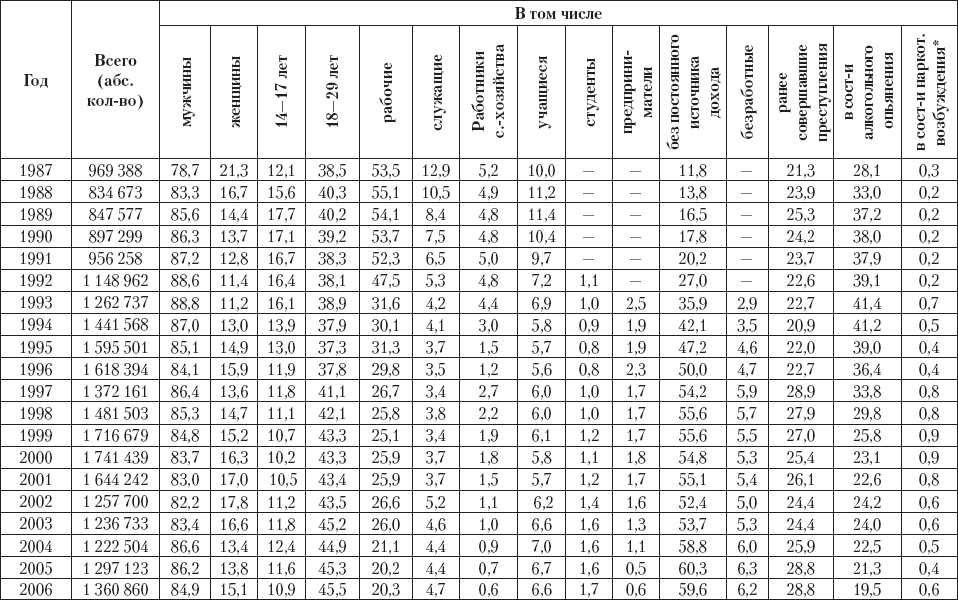 В целом прослеживается тенденция роста «пьяной» преступности в 1987–1994 гг. (с 28 до 41 %) с последующим снижением до 19,5 % в 2006 г. Особенно высок удельный вес убийств (71–78 %), причинения тяжкого вреда здоровью (74–80 %), изнасилований (70–78 %), хулиганства (72–75 %), совершенных в состоянии алкогольного опьянения. Заметим, что до 1917 г. удельный вес «пьяной» преступности был значительно ниже (в среднем 11 %, по данным М. Н. Гернета), равно как и в 20-е гг. XX столетия (6–15 %).