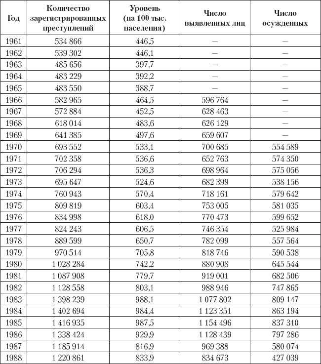 Значительно более полные, сопоставимые и интересные для нас, современников, сведения о зарегистрированной преступности в России имеются с 1961 г. Некоторые из них представлены в табл. 3.4. На основании этих данных, тоже далеко не полных, можно сделать ряд выводов.