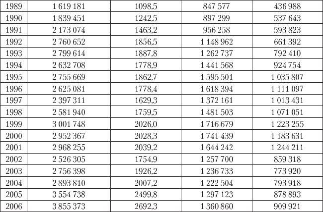 Во-первых, наблюдается интенсивный рост тяжких преступлений в 1989–1994 гг. Так, по сравнению с 1987 г. (наименьшие показатели эпохи «перестройки»), уровень умышленных убийств (с покушениями) к 1994 г. вырос в 3,5 раза, тяжких телесных повреждений – в 3,3 раза (при росте общей преступности за те же годы в 2,2 раза). Уровень грабежей за 1987–1993 гг. вырос в 5,9 раза, разбойных нападений – в 6,9 раза (при росте общей преступности за те же годы в 2,3 раза).