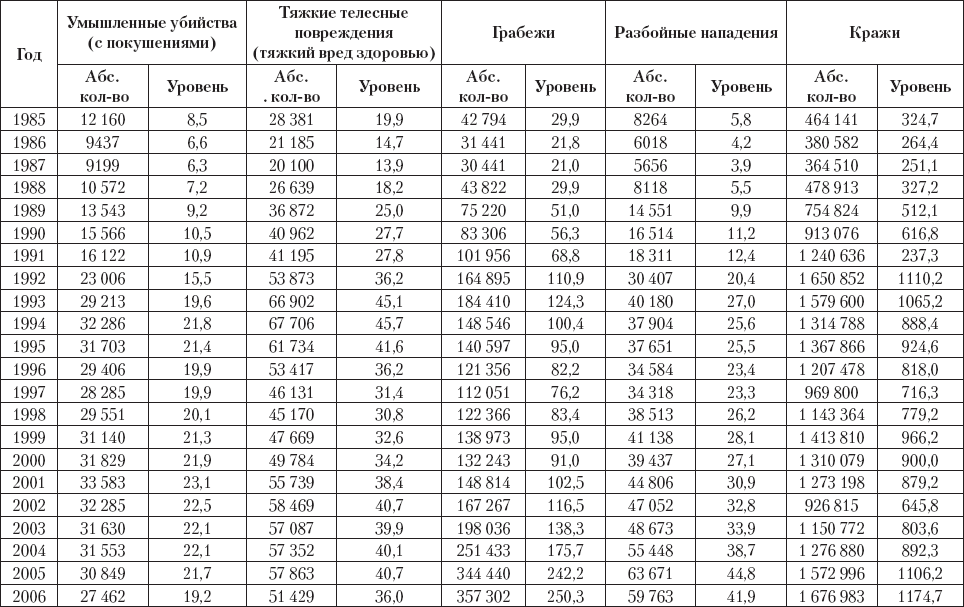 Приведенные в этой таблице данные показывают, как Россия после 1988 г. перешла из группы стран со средним значением индекса насилия в группу стран с высоким показателем. Следует особенно отметить нарастание этого индекса насилия с 2000 г. В отдельных регионах, например в Санкт-Петербурге, начиная с 1993 г. этот показатель превысил 1 (1985 г. – 0,32; 1990 г. – 0,45; 1992 г. – 0,81; 1993 г.– 1,15; 1994 г.– 1,25; 1995 г.– 1,14; 1998 г.– 1,11).