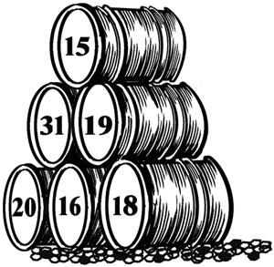 В магазин доставили 6бочек керосину. На этом рисунке обозначено, сколько ведер было в каждой бочке. В первый же день нашлось два покупателя; один купил целиком две бочки, другой – три, причем первый купил вдвое менее керосина, чем второй. Не пришлось даже раскупоривать бочек.