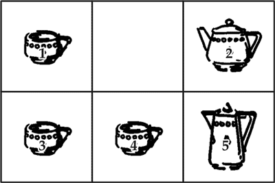 Стол разграфлен на 6квадратов, в каждом из которых, кроме одного, помещается какой-нибудь предмет. Я воспользовался чайной посудой и разместил но квадратам 3 чашки, чайник и молочник, как показано на рисунке.