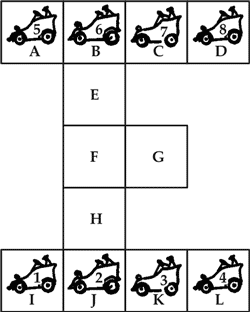 Предположите, что восемь автомобилей стоят в указанных здесь положениях. Как могут автомобили 1, 2, 3 и 4 перемениться местами с автомобилями 5, 6, 7 и 8? И при каком способе обмена они сделают наименьшее число переездов?