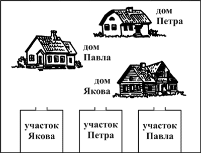 Три брата – Петр, Павел и Яков – получили для обработки три участка земли, расположенные рядом, невдалеке от их домов. На чертеже вы видите расположение домов Петра, Павла и Якова и соответствующих земельных участков.