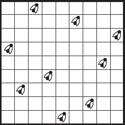 Спустя несколько минут три мухи переменили свое место и переползли в соседние, незанятые клетки; остальные 6 остались на местах. И курьезно: хотя три мухи перешли на другие места, все 9 снова оказались размещенными так, что никакая пара не находилась в одном прямом или косом ряду.