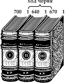 И если червь проделал ход от 1-й страницы 1 тома до последней страницы III тома, то он прогрыз всего только 640 страниц среднего тома, да еще 4 крышки переплета, – не более.