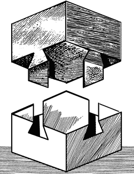 ЗАДАЧА № 29 Как это сделаноВы видите здесь деревянный куб, сделанный из двух кусков дерева: верхняя половина куба имеет выступы, входящие в выемки нижней части. Но обратите внимание на форму и расположение выступов и объясните: как ухитрился столяр соединить оба куска?