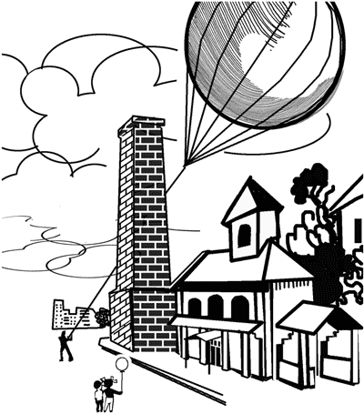 Фабричная труба на рис. 35 заслоняет часть каната, к которому привязан воздушный шар. Но художник как будто ошибся – канат вправо от трубы разве составляет продолжение левой части каната? Исправьте рисунок.