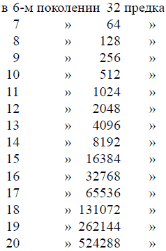 Каждый из моих двух дедов и каждая из моих двух бабушек также имели отца и мать. Следовательно, в 4-м поколении у меня 8прямых предков. Восходя к 5-му, 6-му, 7-му и т. д. поколению назад, я нахожу, что число моих предков все возрастает и притом чрезвычайно обильно. А именно: